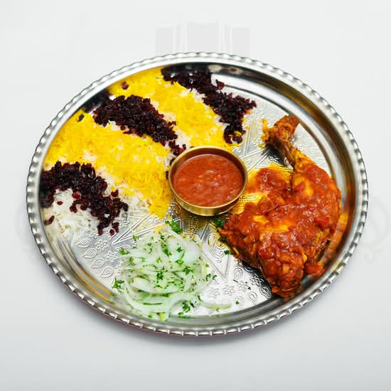 Cuisse de poulet marinée, servie avec du riz persan mélangé à l’épine-vinette30 CHF
